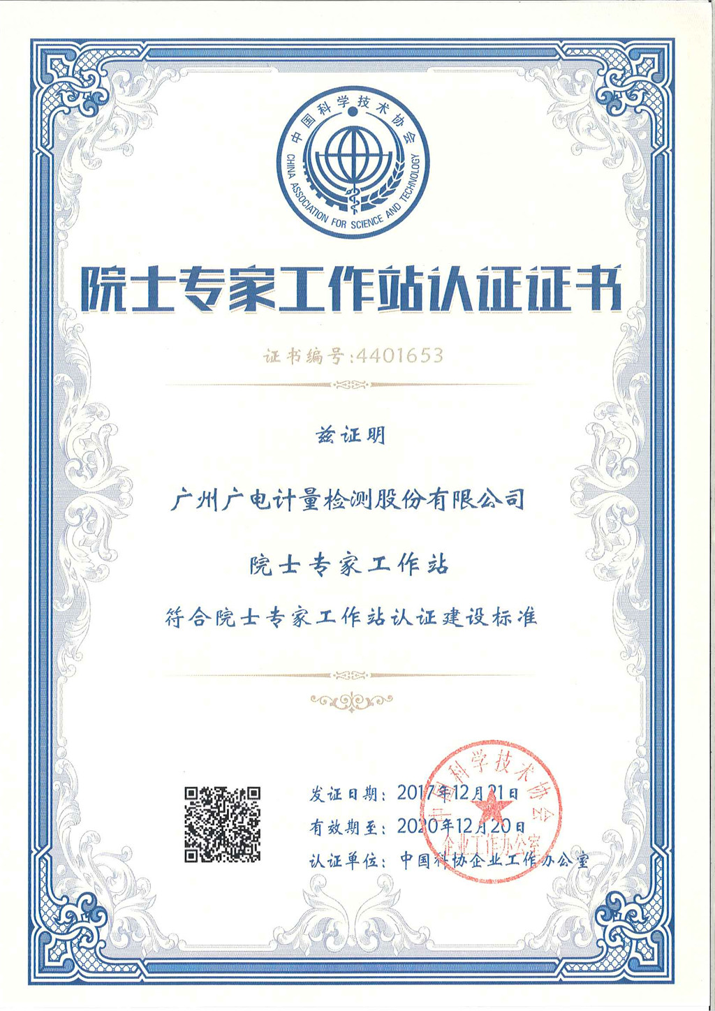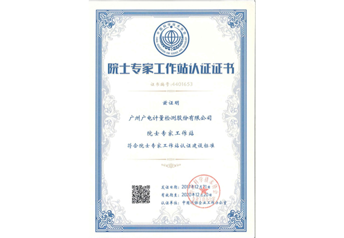廣電計量院士專家工作站認證證書