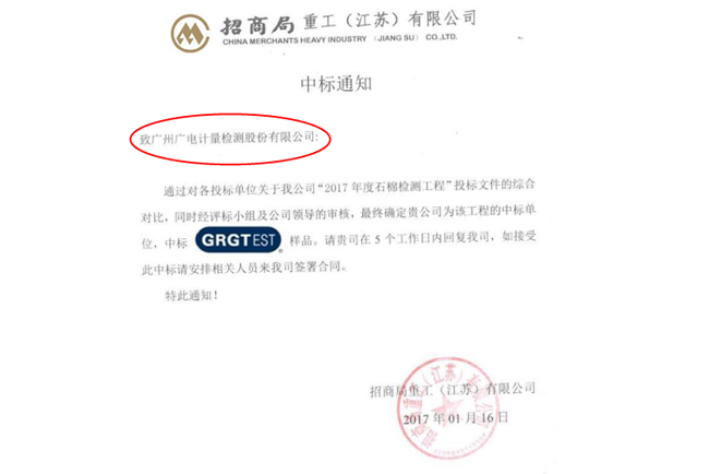 2月22日,招商局重工(江蘇)有限公司發來通知:經過對投標文件的綜合評比,同時經評標小組及公司領導的審核,最終確定廣電計量作為招商局重工(江蘇)有限公司“2017年度石棉檢測工程”的中標單位。
