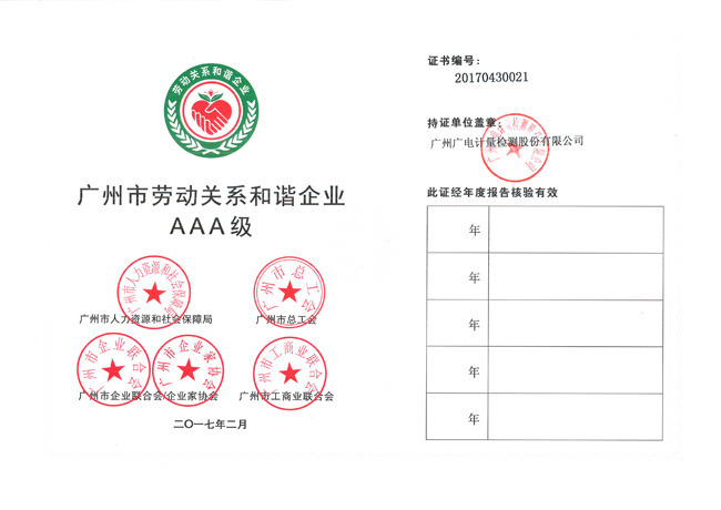 榮獲“廣州市勞動關系和諧企業AAA級”稱號,對于廣電計量來說,象征著一份榮譽,也意味著一份責任。展望未來,廣電計量將繼續加強科學管理,開拓創新,發揮工會的橋梁紐帶作用,打造一個勞動關系和諧發展的企業。