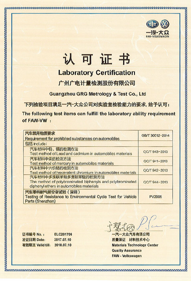 近日,一汽大眾汽車有限公司公布了最新的授權(quán)實驗室認可名單。經(jīng)過資格審查、能力評估、現(xiàn)場測評等一系列嚴格的評比和考核,廣電計量通過現(xiàn)場審核成為一汽大眾授權(quán)檢測實驗室,獲得授權(quán)檢測服務(wù)的能力范圍包括汽車禁用物質(zhì)、汽車零件耐氣候交變試驗檢測。今后,廣電計量將持續(xù)為一汽大眾及其供應(yīng)商提供專業(yè)技術(shù)服務(wù),探索更深層次的合作模式,為汽車生產(chǎn)企業(yè)在源頭進行產(chǎn)品質(zhì)量管控,構(gòu)建綠色供應(yīng)鏈助力。