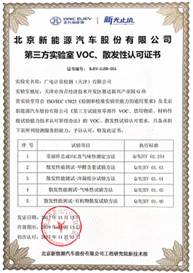 本次廣電計量獲頒《第三方實驗室VOC、散發性認可證書》,是繼2016年成為北汽新能源指定的第三方ELV實驗室之后,在零部件VOC及散發性領域再度獲得的認可,為雙方開展深入合作打下了重要基礎。后續,廣電計量將持續為北汽新能源提供專業技術保障,在既有的整車ELV拆檢等技術服務的基礎上,將合作范圍擴充至內飾零部件及整車氣味性測試、VOC測試分析等領域。