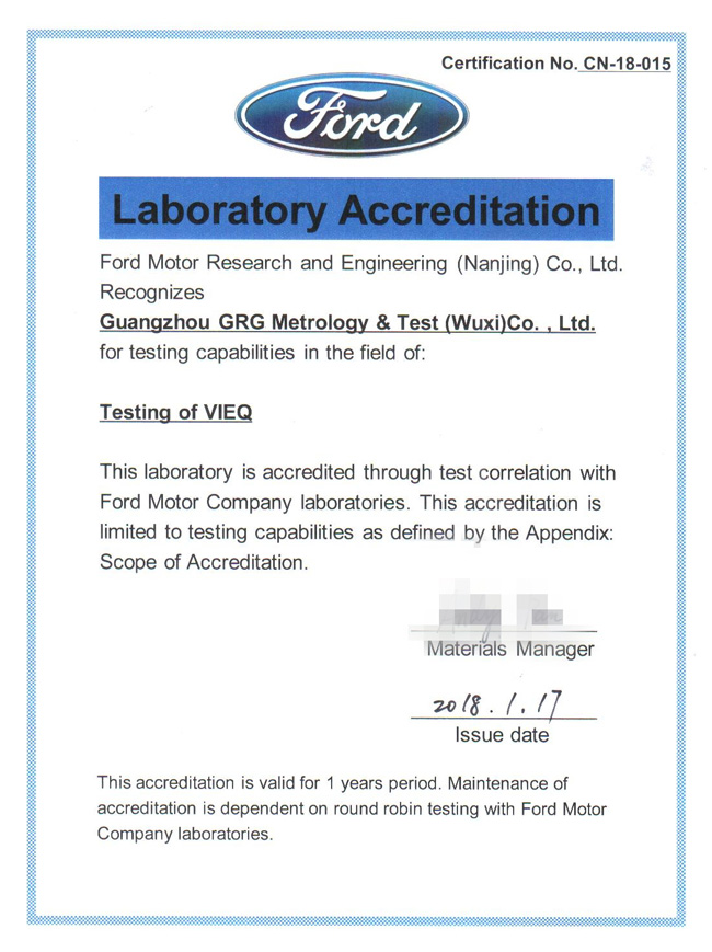 無錫子公司獲得福特汽車第三方實(shí)驗(yàn)室VOC認(rèn)可