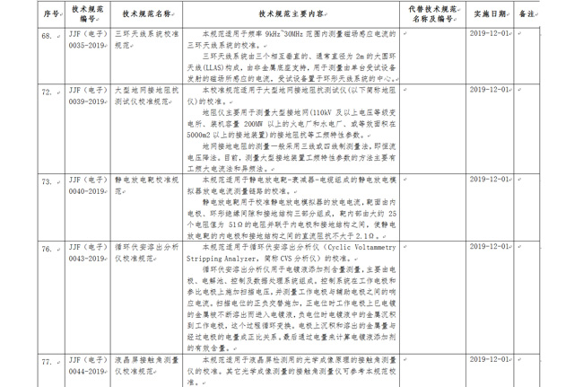 日前,國家工業和信息部發布公告,批準了311項行業標準、1項汽車行業標準修改單、88項行業計量技術規范,并于2019年12月1日正式實施。其中,由廣電計量技術研究院技術專家團隊主導編寫的《三環天線系統校準規范》、《大型地網接地阻抗測試儀校準規范》、《靜電放電靶校準規范》、《循環伏安溶出分析儀校準規范》、《液晶屏接觸角測量儀校準規范》等5項電子行業校準規范,以及參與編寫的《電磁耦合鉗校準規范》頒布實施。