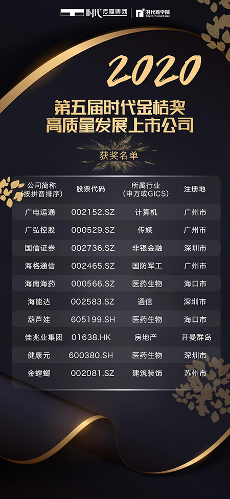 近期,由廣東時(shí)代傳媒集團(tuán)推出的“第五屆時(shí)代金桔獎(jiǎng)高質(zhì)量發(fā)展上市公司”評(píng)選結(jié)果揭曉。憑借規(guī)范的公司治理、卓越的董事會(huì)建設(shè)和優(yōu)秀的投資者關(guān)系管理,廣電計(jì)量入選“2020年第五屆時(shí)代金桔獎(jiǎng)高質(zhì)量發(fā)展上市公司”榜單。