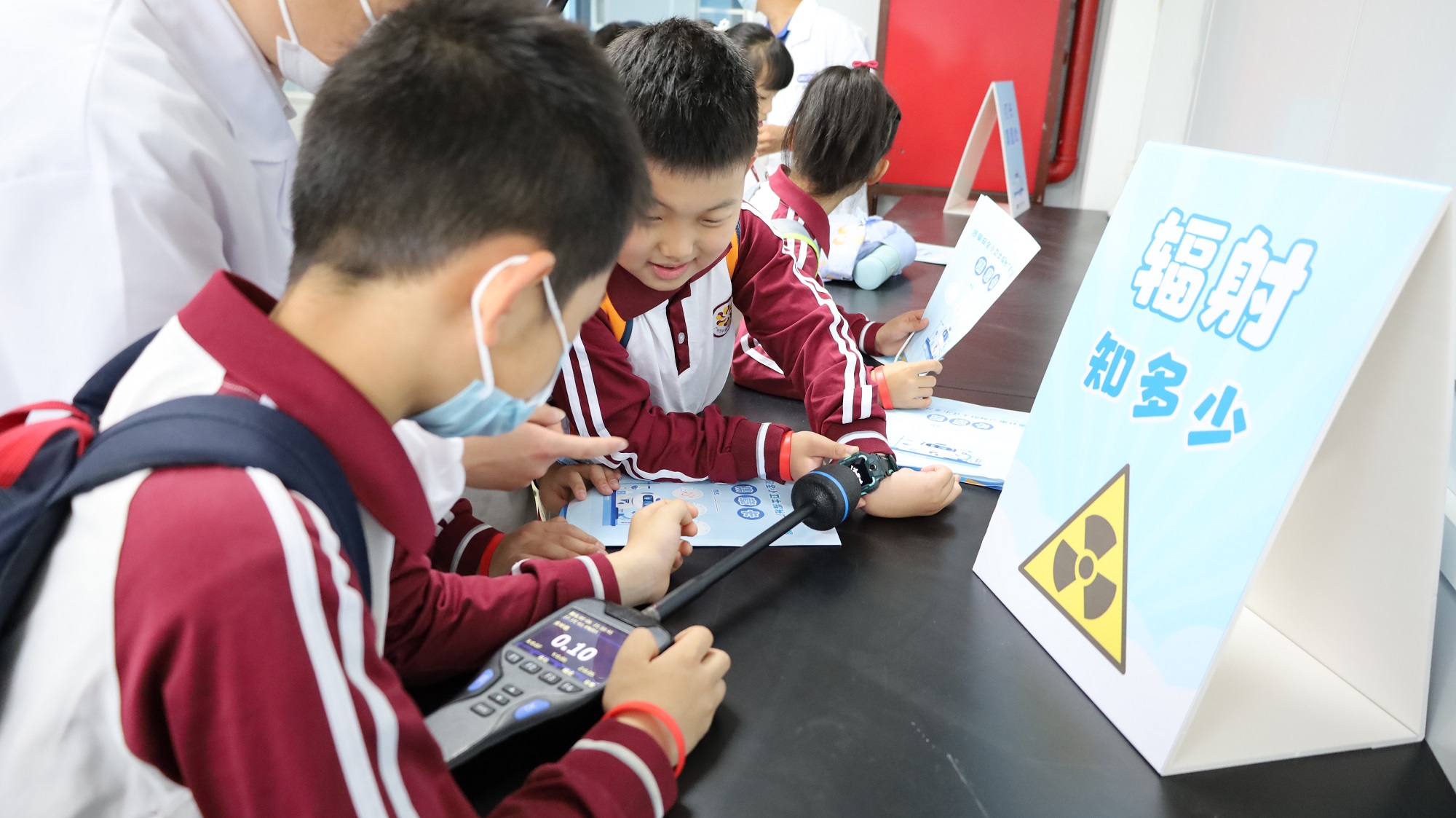 輻射檢測體驗(yàn)環(huán)節(jié),學(xué)生們拿出自己隨身佩戴的電話手表,檢測其使用過程中的輻射值