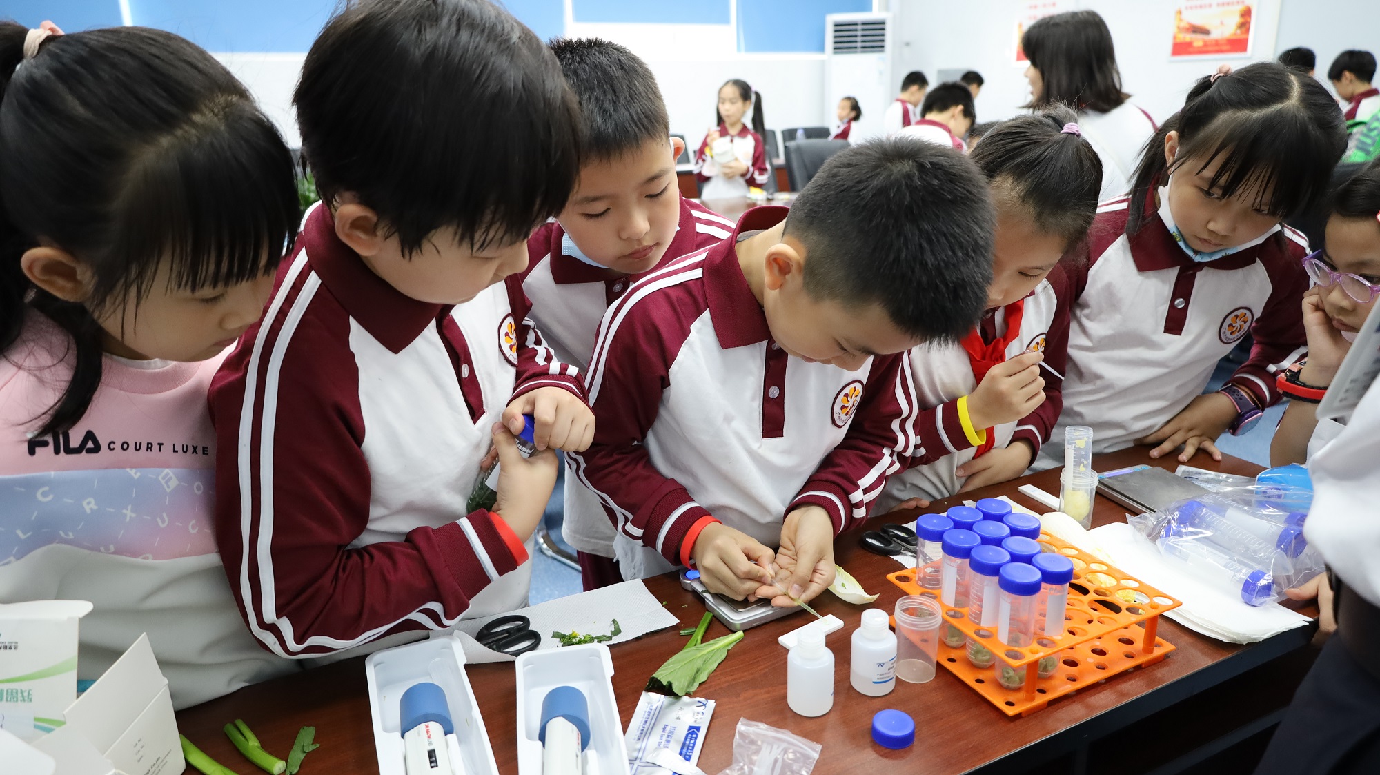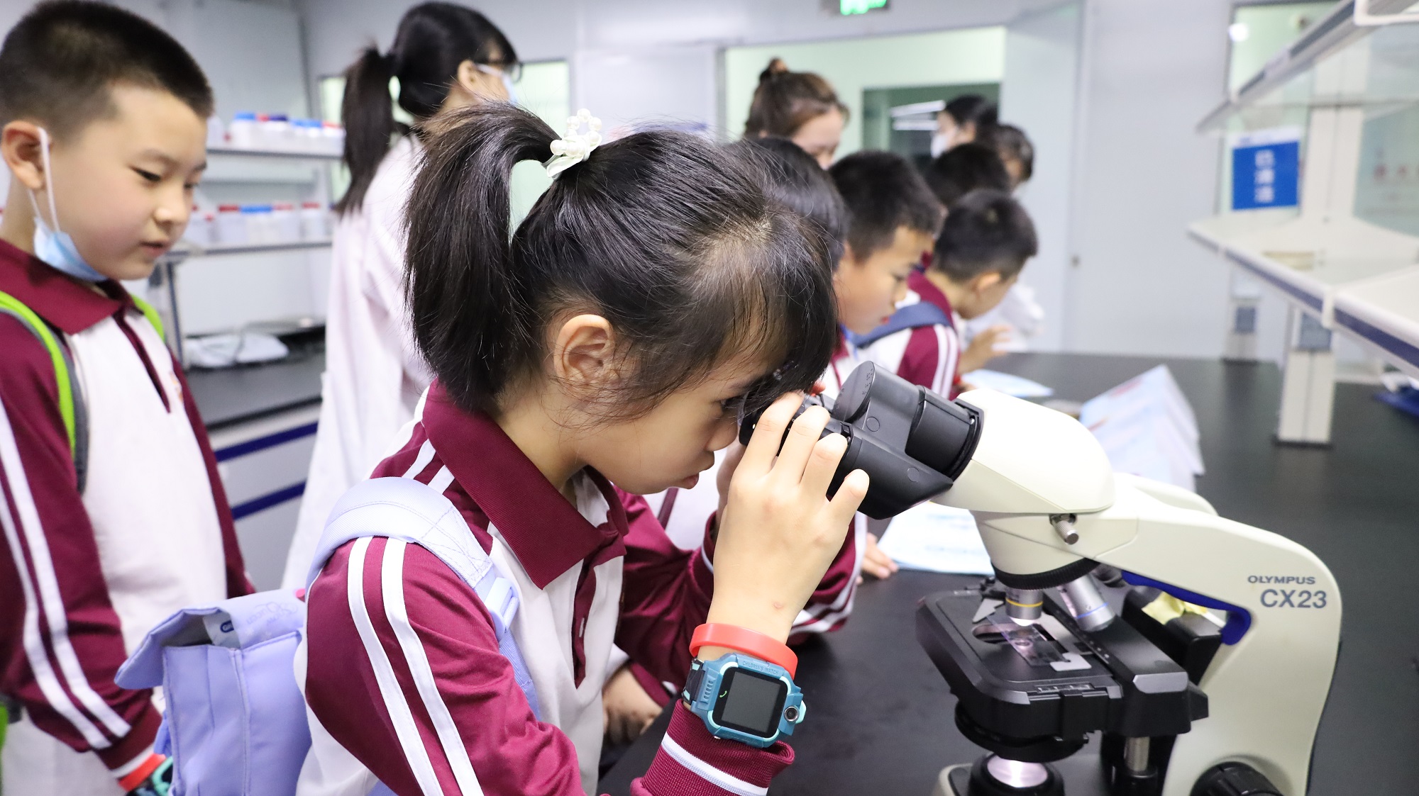 微生物觀測環(huán)節(jié),小學(xué)生們認(rèn)真觀測細(xì)菌培養(yǎng)皿,并通過顯微鏡看到細(xì)菌的“真面目”