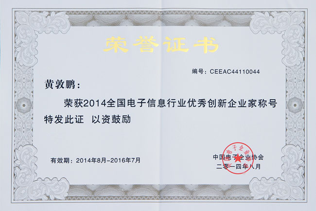8月9-10日,由中國電子企業(yè)協會、滇中產業(yè)聚集區(qū)(新區(qū))管理委員會聯合舉辦的“跨界創(chuàng)新科學發(fā)展——企業(yè)家活動日暨2014全國電子信息行業(yè)優(yōu)秀企業(yè)家表彰大會”在昆明隆重舉行。GRGT黃敦鵬總經理榮獲“2014全國電子信息行業(yè)領軍優(yōu)秀創(chuàng)新企業(yè)家”稱號。