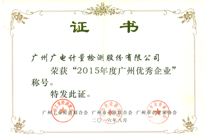 廣電計量獲授“2015年度廣州優秀企業”稱號