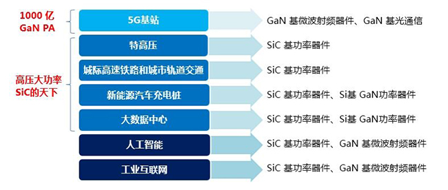第三代半導(dǎo)體在新基建七大領(lǐng)域都有其廣泛的應(yīng)用前景。在5G基站領(lǐng)域, GaN PA(即氮化鎵功率放大器)是5G基站的最優(yōu)選擇,預(yù)計(jì)在2025年前,我國 5G 宏基站預(yù)計(jì)將建設(shè)超過500萬站,而5G宏基站、微基站、及毫米波基站帶來的GaN PA 市場規(guī)模將超過1000億元,而特高壓、高鐵和軌交、充電樁、大數(shù)據(jù)中心等高壓大功率領(lǐng)域都將是SiC的天下。