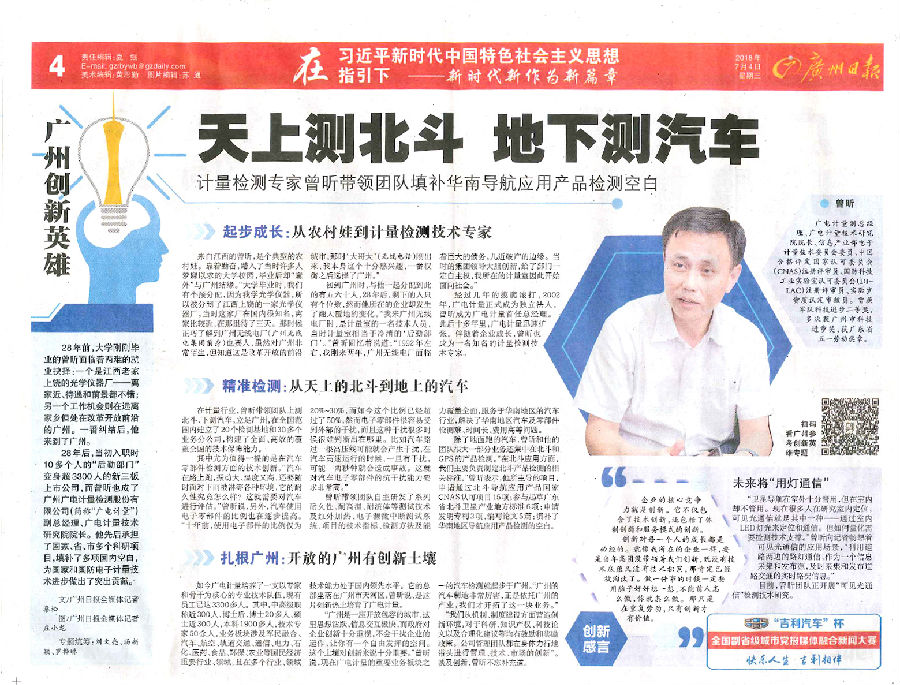 近年來,廣電計量以創新驅動發展,強化機制創新、管理創新、技術創新,邁入高速發展軌道,成為國有檢測機構市場化運作的先行者,在多個計量檢測技術領域位居行業前列,涌現出一大批優秀創新人才。日前,公司副總經理、技術研究院院長曾昕作為計量檢測行業技術專家、公司的技術創新代表,接受了《廣州日報》專訪,回顧了十八年如一日奮斗在計量檢測技術研發一線的歷程,分享了創新心得,介紹了公司在軍民融合、汽車、航空、軌道交通等國民經濟重要行業、領域取得的技術創新成果。