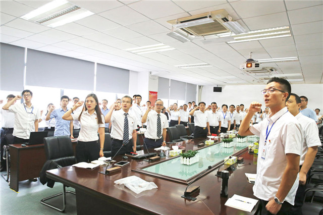 隨后,廣電計量全體黨員面向黨旗肅立、舉起右手,重溫入黨誓詞,并齊聲朗讀《黨章》中關于黨的紀律節選。響亮的聲音回蕩在會議室內,在全體黨員同志心中激蕩起不忘初心、牢記使命的奮進力量。