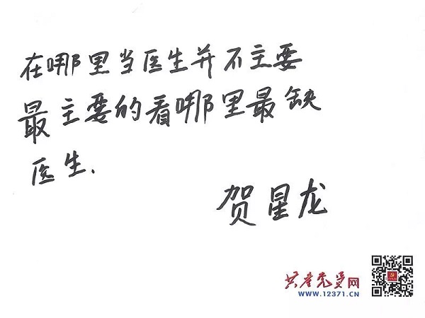 這些年他免去父老鄉(xiāng)親們的出診費、醫(yī)藥費等,加起來至少有三四十萬元,他卻一把火把賬本都燒了。村里的老人們怕他離開,對他說:“星龍,你不敢走,你走了我們就活不成了。”對于這些,賀星龍都明白。他回村行醫(yī)已經(jīng)18年,他說他會繼續(xù)堅持下去。他寫下這樣一句話——“在哪里當醫(yī)生并不主要,最主要的看哪里最缺醫(yī)生。”