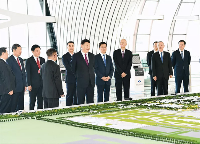 2019年9月25日上午,北京大興國際機場投運儀式在北京舉行。中共中央總書記、國家主席、中央軍委主席習近平出席儀式,宣布機場正式投運并巡覽航站樓。這是習近平在綜合交通中心聽取機場綜合交通體系建設情況介紹。 新華社記者 謝環馳/攝