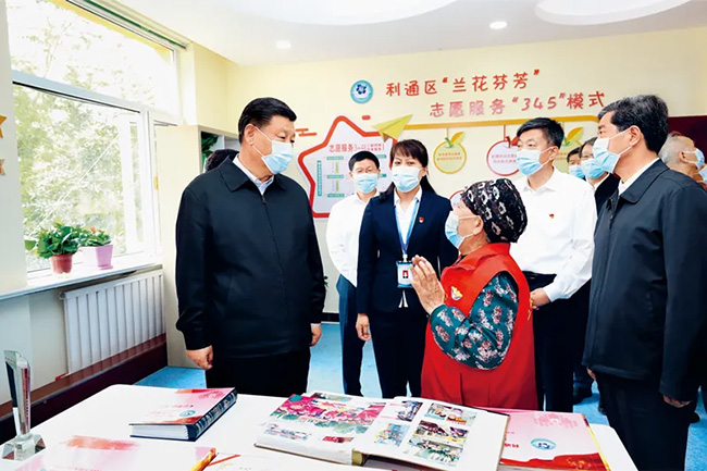 2020年6月8日至10日,中共中央總書記、國家主席、中央軍委主席習近平在寧夏考察。這是6月8日下午,習近平在吳忠市利通區金花園社區黨群活動服務中心,同社區志愿者代表親切交談。新華社記者 鞠鵬/攝