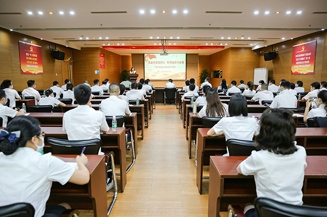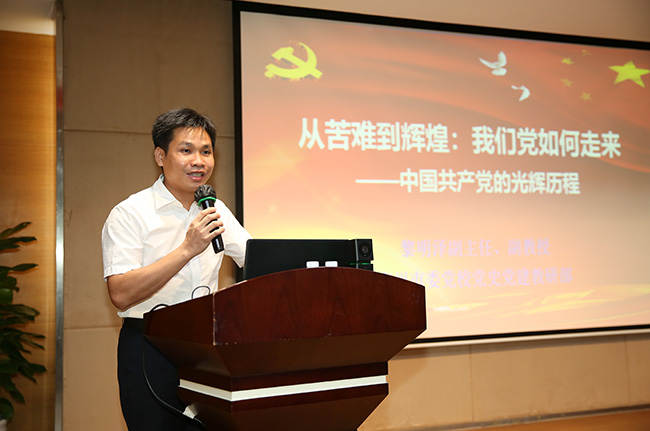 隨后,會議還特別邀請到了中共廣州市委黨校(廣州行政學院)黨史黨建教研部副主任、副教授,華南師范大學碩士生導師黎明澤向與會黨員分享黨課《中國共產黨的光輝歷程》。黎明澤教授從“破繭:生于亂世先天不足” “苦難:歷史與人民的選擇”和“輝煌:曲折后的偉大創造”三個歷史階段,與大家一起重溫了中國共產黨從成立到發展壯大至今的波瀾壯闊、跌宕起伏的奮斗歷程。