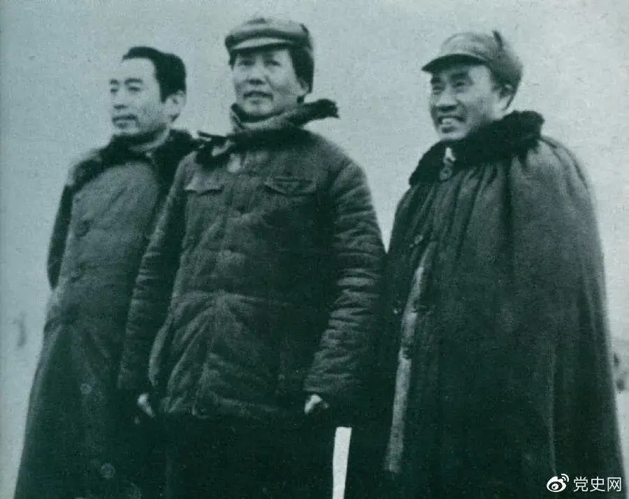 1946年3月4日,毛澤東和朱德、周恩來在延安機(jī)場。