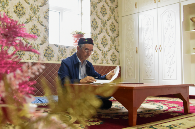 在新疆伊寧縣溫亞爾鎮布力開村,買買提江·吾買爾在家學習。丁磊攝(新華社)