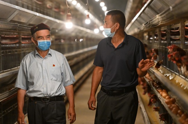 在新疆伊寧縣溫亞爾鎮布力開村玉林禽蛋養殖專業合作社,買買提江·吾買爾(左)與養殖戶交流。丁磊攝(新華社)