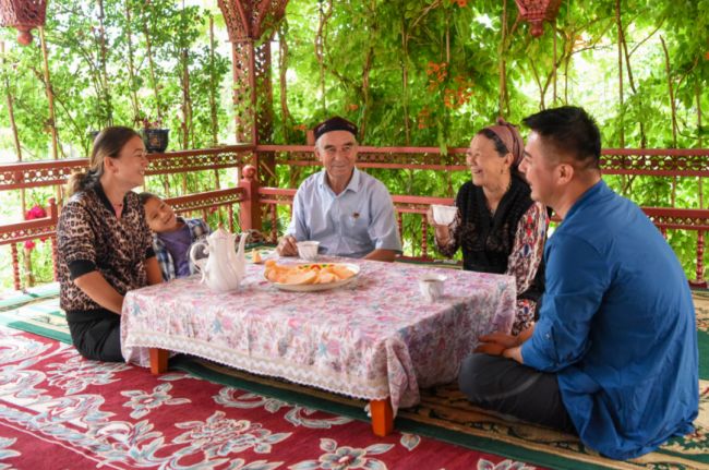 在新疆伊寧縣溫亞爾鎮布力開村,買買提江·吾買爾(中)一家人在聊天。丁磊攝(新華社)