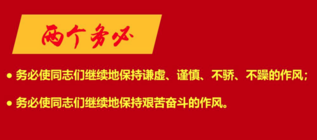 習近平總書記強調:“對毛澤東同志提出‘兩個務必’的深邃思想和戰略考慮,我們要不斷學習領會。我們要不斷向全黨嚴肅鄭重地提出這個問題,始終做到謙虛謹慎、艱苦奮斗,使我們的黨永遠不變質、我們的紅色江山永遠不變色。”牢記是為了更好出發。只有始終牢記全心全意為人民服務的宗旨,才能始終同人民風雨同舟、領航中國號巨輪破浪前行;只有保持謙虛、謹慎、不驕、不躁的作風,只有保持艱苦奮斗的作風,才能始終同人民密切聯系在一起,在這場歷史性考試中經受考驗,不斷向歷史、向人民交出新的更加優異的答卷。