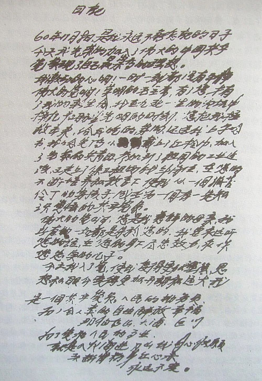 1960年10月的一天,在原沈陽軍區工兵團(工程兵10團)政委韓萬金的辦公桌上,放著一份雷鋒的自述材料,題目是《解放后我有了家,我的母親就是黨》。這份材料的形成過程是這樣的:團黨委樹立雷鋒為“艱苦奮斗、勤儉節約標兵”以后,為使全團同志具體了解雷鋒的先進思想和模范事跡,韓萬金責成政治處幫助雷鋒把他在舊社會的苦難遭遇和中華人民共和國成立后的成長經歷寫成材料印發各連黨支部。為此,政治處把雷鋒找來聽他詳細匯報,邊聽邊記錄,整理成這份近萬字的材料。最后讓雷鋒過目、修改、定稿,他做了些刪節和修改,并把《雷鋒同志模范事跡材料》改成《解放后我有了家,我的母親就是黨》。
